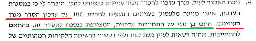 כבר במסמך הראשי של עו"ד דנה נויפלד, כתוב במשתמע, ש-IBC היא "לא ברשימת הלקוחות המהותיים של המשרד". מה זה לא מהותי? זה לא ברור... או ש-IBC כעת מקבוצת סלקום היא לקוח של המשרד, ואז יש ניגוד עניינים חמור, או שהיא לא לקוח של המשרד.