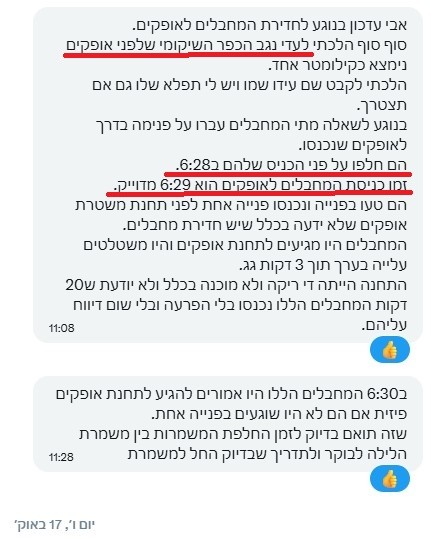 כ"כ "יש ברשותי גם צילום ממצלמת אבטחה ביתית באותה שכונה (כאן) ורואים בברור את השעה: 06:41:50 (שמתאימה לסרטון) והמצלמה הזו נבדקה היטב שאין טעות בשעה שמופיעה בצילום".