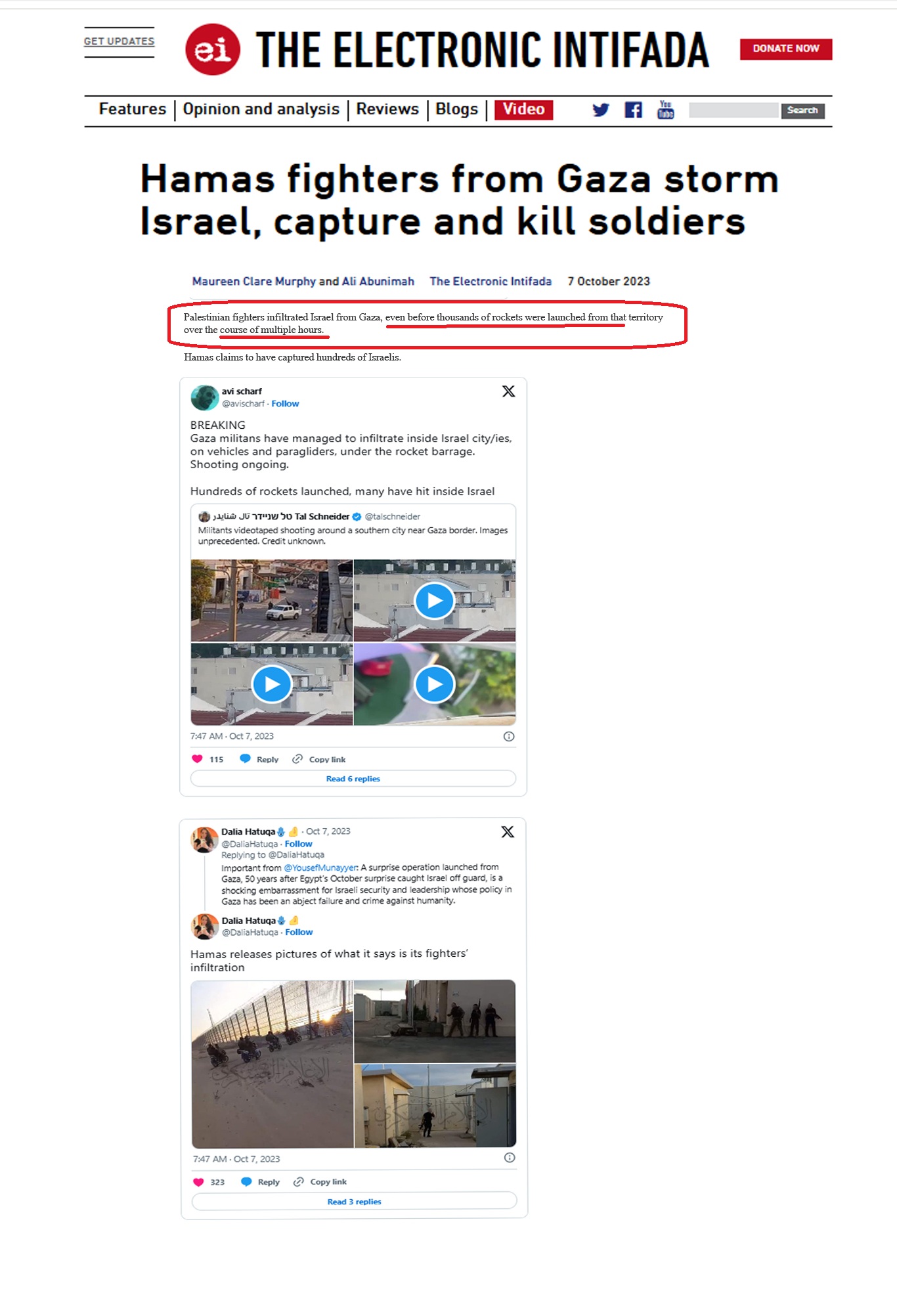 ב. סא"ל במיל. יהונתן דחוח-הלוי פרסם כאן (כותרת בלבד): "מחקר סרטוני הווידאו שצילמו גדודי אל-קסאם מצא כי אחת החוליות שחדרו לישראל בבוקר ה-7 באוקטובר 2023, הייתה מוכנה בשעה 06:31 בטנדר בנקודת הזינוק לקראת פריצת הגבול, שתי דקות לאחר תחילת מתקפת הרקטות.
