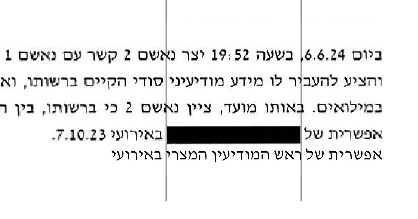 13.1.25: א. פורסם כאן: הותר לפרסום סעיף מושחר בכתב האישום של פלדשטיין והנגד רוזנפלד: "מידע סודי על מעורבות אפשרית של - גורמים מדינתיים - שייתכן והיה להם קשר / מידע אודות אירוע ה-7 באוקטובר". כתב האישום המלא (עם השחרות) מצוי - כאן. הערות מערכת: לכן נראה, שיש כמה אפשרויות ל"גורמים מדינתיים". ביניהן: "הרשות הפלסטינית" (ראו עדכון לעיל מ-5.12.24) או "המודיעין המצרי" (ראו לעיל עדכון מ-12.1.25), ליתר דיוק: "ראש המודיעין המצרי" (לשעבר) (שניזון גם ממנהיג החמאס, יחיא סינוואר).