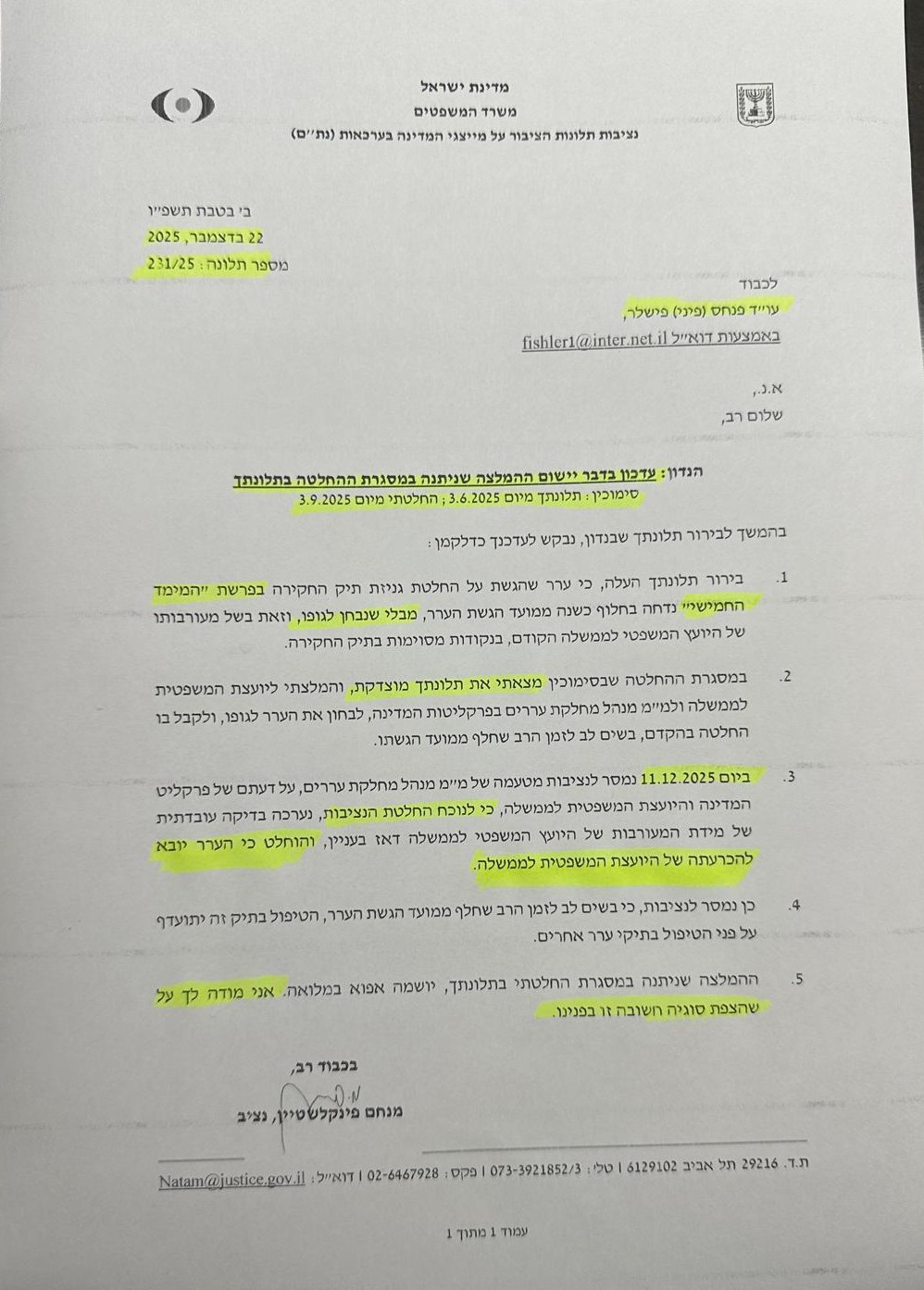 ב-23.7.23 התקבלה תגובת נציב תלונות הציבור על מייצגי המדינה בערכאות (נת"ם) מהשופט בדימוס
