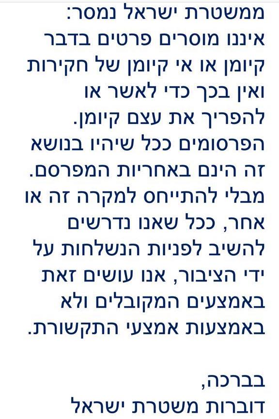 בעקבות פנייתי למשטרה קיבלתי את התגובה הבאה: "איננו מוסרים פרטים בדבר קיומן או אי קיומן של חקירות ואין בכך כדי לאשר או להפריך את עצם קיומן. הפרסומים ככל שיהיו בנושא זה הינם באחריות המפרסם. מבלי להתייחס למקרה זה או אחר, ככל שאנו נדרשים להשיב לפניות הנשלחות על ידי הציבור, אנו עושים זאת באמצעים המקובלים ולא באמצעות אמצעי התקשורת".