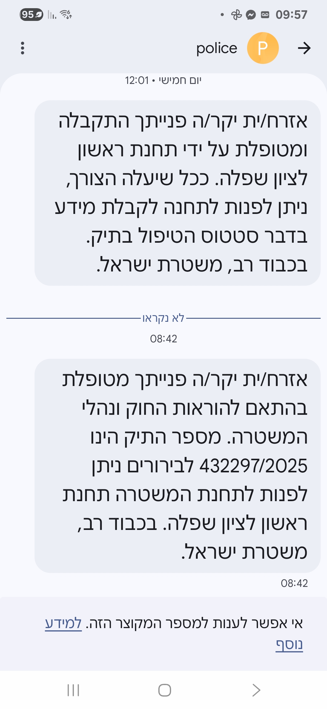 כאן. התלונה החדשה משום מה לא צורפה לתיק הקודם בנושא מה-19.7.25 (פלא 326106/2025) ונפתח בגינה תיק פלא חדש: 432297/2025 -