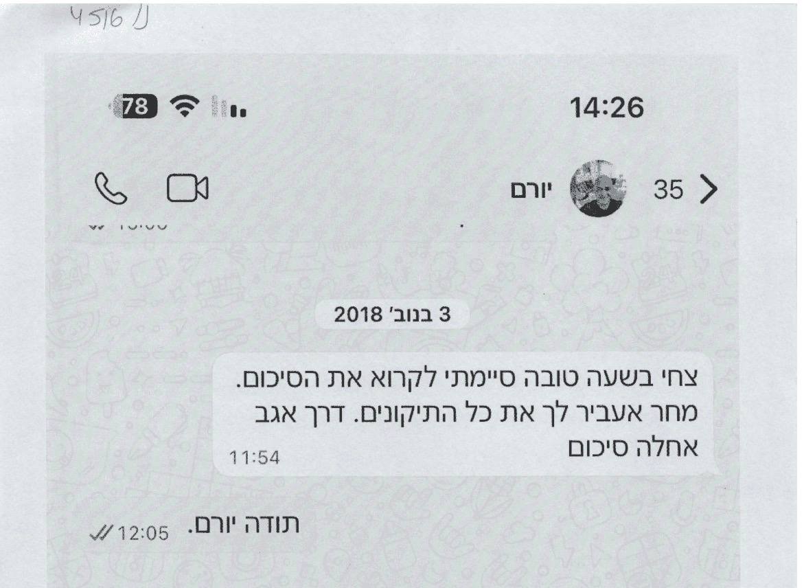 צחי בשעה טובה סיימתי לקרוא את הסיכום. מחר אעביר לך את כל התיקונים. דרך אגב אחלה סיכום". הודעת הווטסאפ -