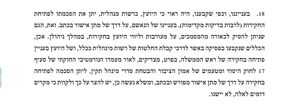 לפסול, מחמת היעדר קבילות, ראיות בתיקים 1000 ו-4000, ככול שייקבע כי פעולות חקירה בוצעו טרם מתן הסכמת היועץ, כפי שתועדה במסמכים או על פי חומרי חקירה אחרים". ובכן, ציטוטי