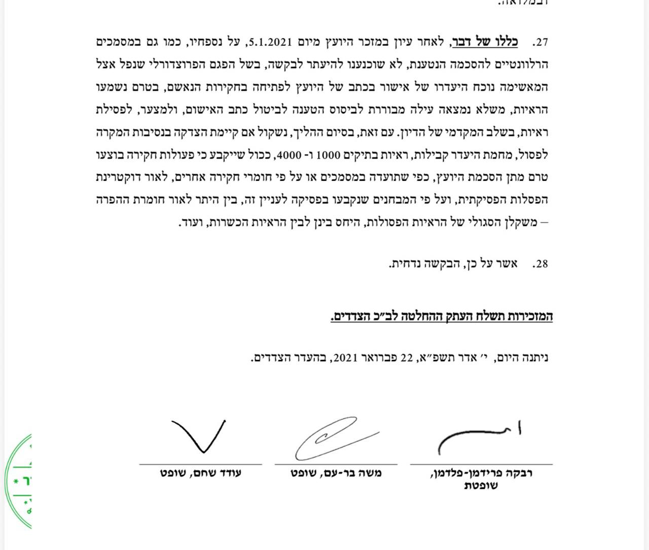 החלטת השופטים המלאה ללא סימון והקטעים של דברי עו"ד ד"ר