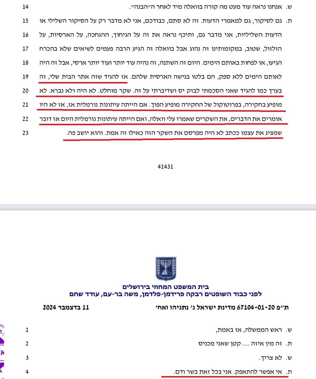 מנדלבליט, כי לשיטתם המקטעים שאושרו לפרסום "עלולים ליצור רושם מוטעה". ראשית, אחרי שהסתירו את הפרוטוקולים מהשופטים, פתאום הפרקליטות מבקשת להשתמש בקטעים נוספים מהפרוטוקולים וברוב חוצפתה מותחת ביקורת על השופטים: "מסירת המקטעים בהחלטת ביהמ"ש במנותק מדברים אלה עלולה להציג תמונה חלקית". שנית, מה פתאום נזכרתם רק עכשיו? למה לא העברתם את מלוא הפרוטוקולים להגנה במסגרת חומרי החקירה? למה הסתרתם אותם ופתאום שולפים אותם? הפרקליטות בלחץ אטומי, נוכח חשיפת האופן העברייני שבו נתפרו התיקים. המסמך -