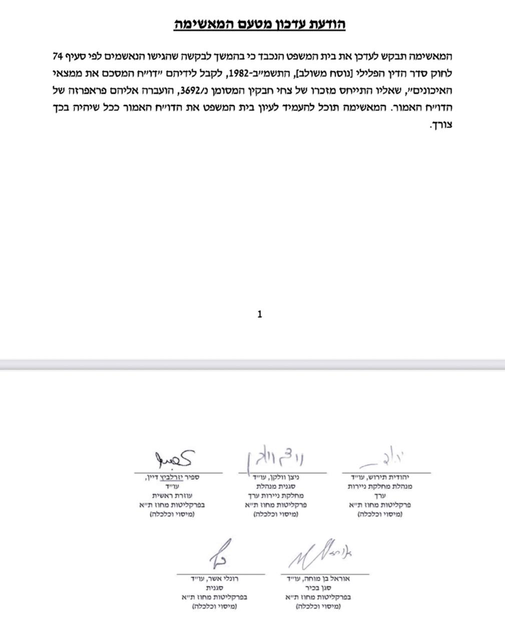 אלוביץ' לתקן את רשימת חומרי החקירה בעקבות שורה של עדויות על הסתרת חומרי חקירה כמו דו"ח האיכונים ועשרות צווי האזנות סתר. שימו לב לתירוץ: "הפרקליטות נדרשת להתייחס לסוגיות שיש להן השלכות רוחב על עבודת הפרקליטות, ומשכך עליה להיוועץ ביחס לתגובה עם מספר גורמים והליך זה אורך זמן רב". המסמך -
