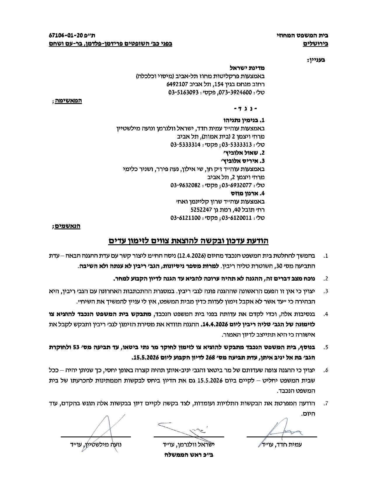 חדד מבקש להוציא לה זימון ליום שלישי, ה-14.4. עדי הגנה נוספים שעתידים להגיע: