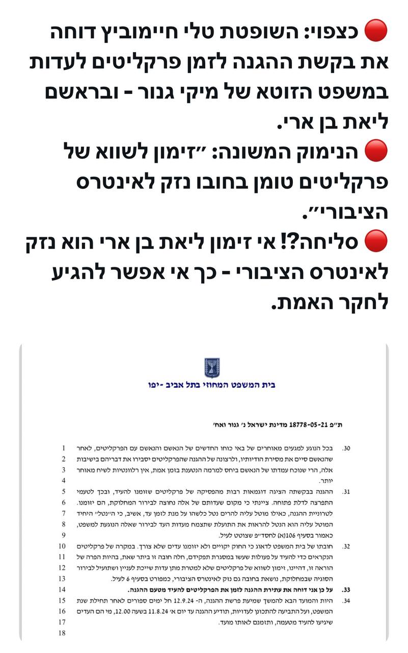 22.6.24אלי ציפורי פרסם בטוויטר: עוד מעדותו המצמררת של מיקי גנור ביום חמישי: ״הם אמרו לי תביא את ביבי ותציל את המשפחה שלך, הבנתי שאני חייב להמציא סיפורים״: גנור על ההבנה שהם רוצים שיהפוך לעד מדינה: "אני חושב שזו הפעם הראשונה שנותנים לי את נאום עד המדינה, אומרים לי בצורה ברורה אנחנו צריכים אותך, סימנו אותך כעד מדינה, הם אומרים לי ששיחדתי את צ'ייניי ואבריאל. כל הנאום שאני מניח שהוכתב לו של עד המדינה. הפגישה עם תלם במקלחת הייתה לפני כן. אני מבין שאני חייב עכשיו להמציא סיפורים על כל מי שהכרתי בסביבה של רוה"מ בכל המעגלים... הם אמרו לי תביא את ביבי ותציל את המשפחה שלך... אנחנו נשים בצד אחד את המשפחה ונאשים אותך בעבירות מס נוראיות ואתה תהיה עד מדינה נגד כל מי שאנחנו חושבים שצריכים עכשיו להפיל אותם, לא משנה מי זה, העיקר מסביבת רוה"מ ושות'".