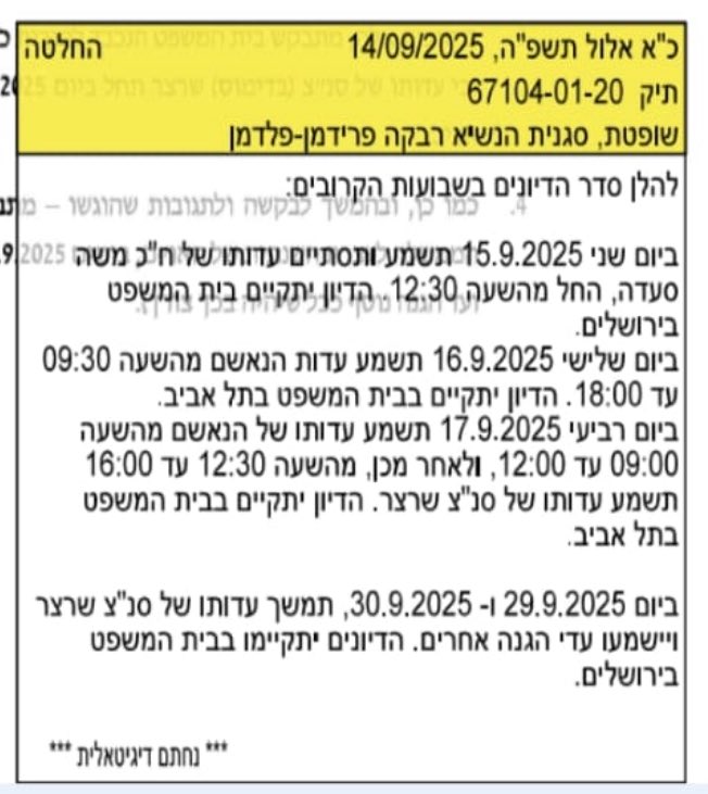 ג. בהקשר לעדכון בסעיף ב' מאתמול (11.9.25), השופטים החליטו שעדות