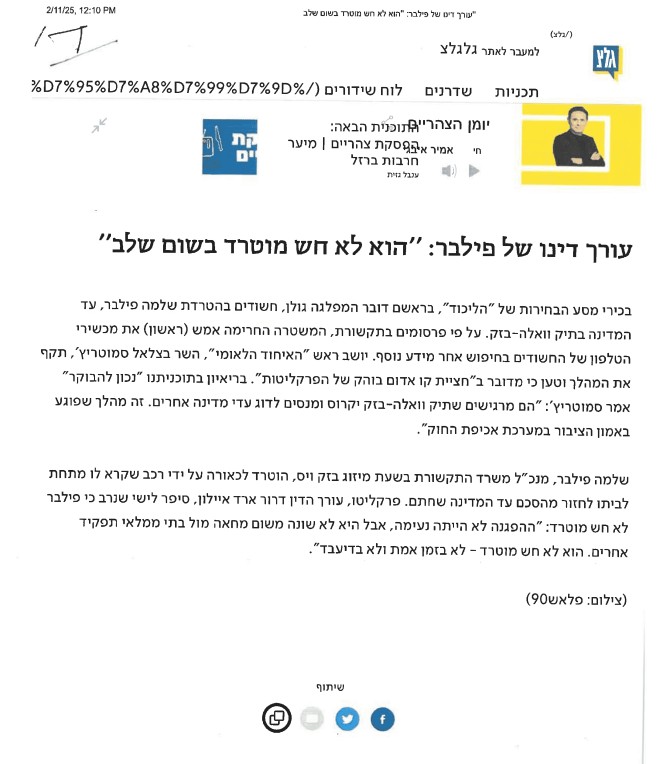 אביעד גליקמן ולא ננקטה כל פעולת חקירה. מסמך התגובה מ- 11.2.25 של