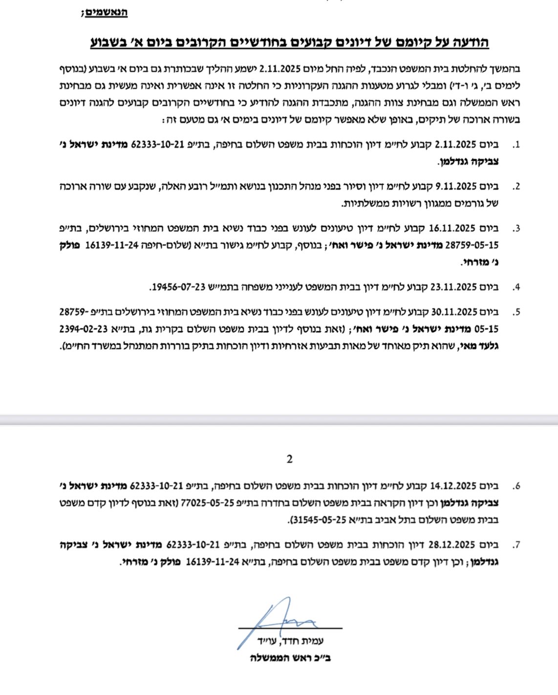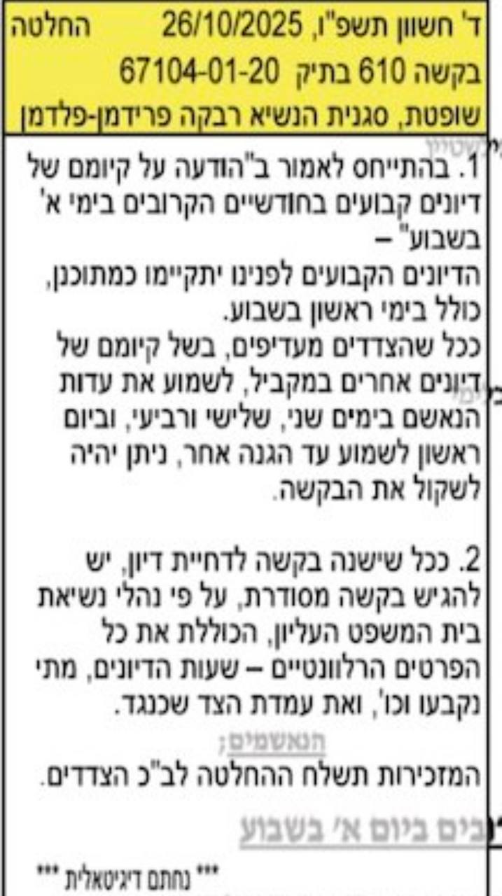 עמית חדד כי יש לו דיונים בכל יום א׳ בחודשיים הקרובים ולכן לא יתאפשר לעבור ל-4 ימי דיונים מתחילת נובמבר: הדיונים יתקיימו כמתוכנן, כל בקשה לדחיית דיון תידון לגופה.