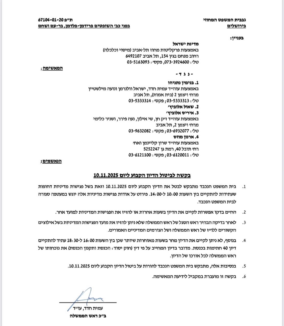 נתניהו: עדותו בוטלה מחר (ב׳) בשל פגישות מדיניות דחופות. המסמך -