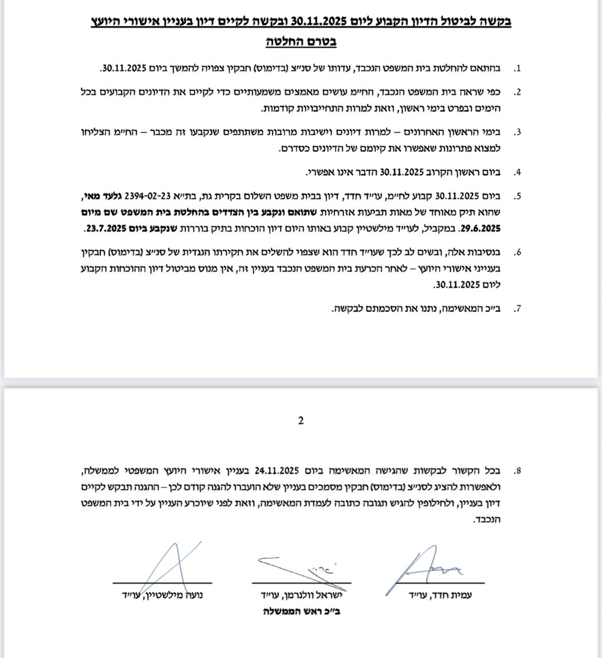 חדד לקיים דיון על אישורי היועמ"ש וזאת עוד לפני שיוכרע העניין ע"יי ביהמ"ש. המסמך -