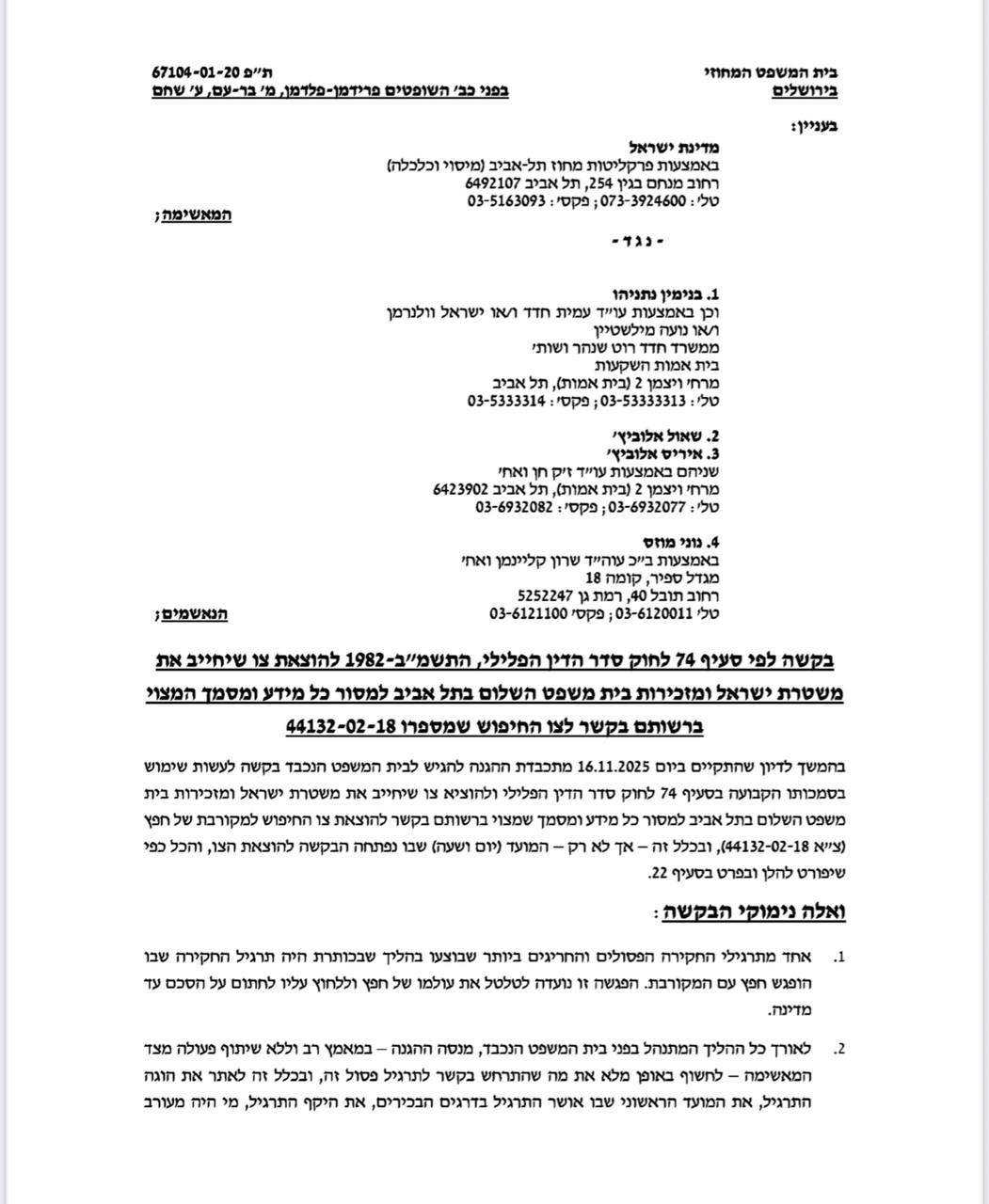 נתניהו מבקשים להוציא צו שיחייב את ביהמ"ש השלום בת"א למסור כל מידע ומסמך המצוי ברשותם בקשר לצו החיפוש שנוגע ל"מקורבת" של